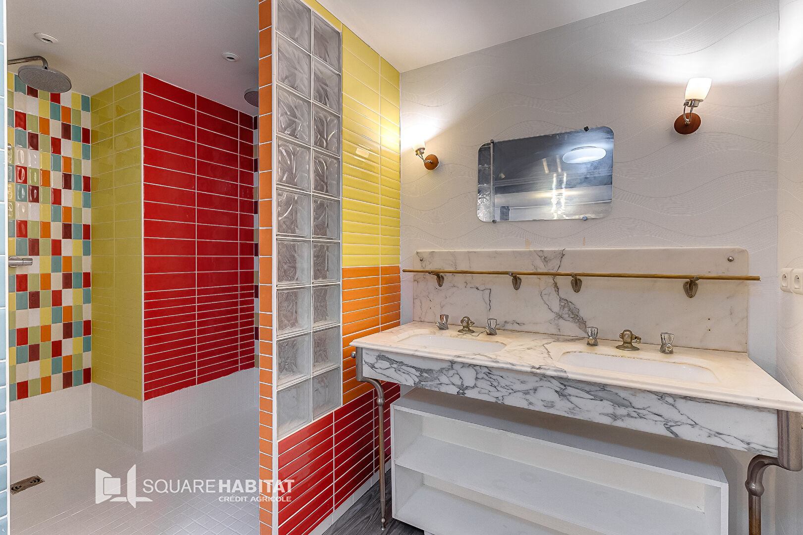 Salle de bains équipée d’une baignoire et d’une double douche