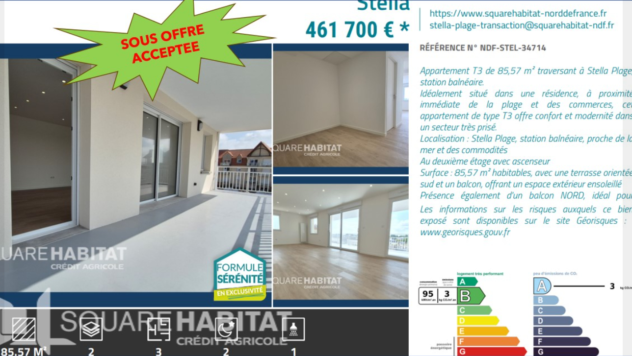 Surface : 85,57 m² habitables, avec une terrasse orientée sud et un balcon, offrant un espace extérieur ensoleillé