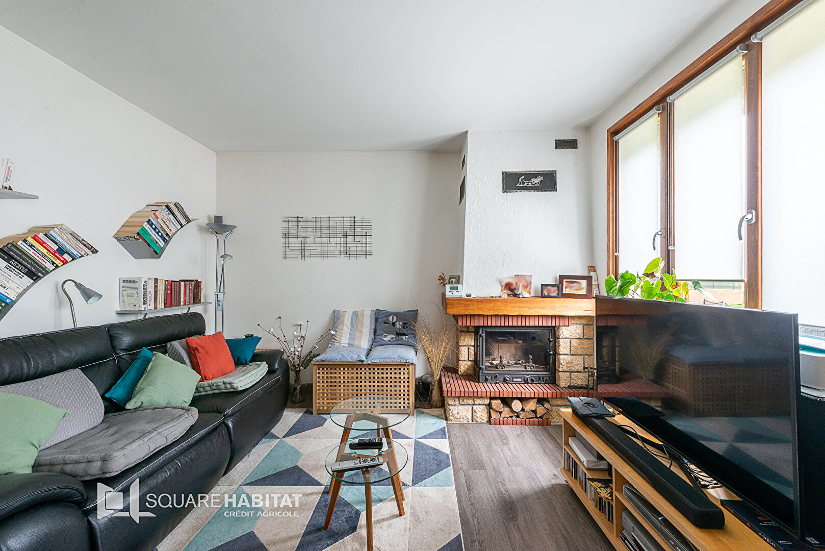Séjour lumineux avec cheminée équipée d’un insert bois