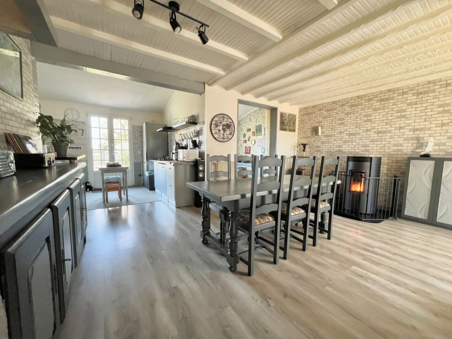 Vous serez séduit par un salon séjour équipé d’un poêle à pellets, ouvert sur une cuisine équipée idéal pour les moments conviviaux.