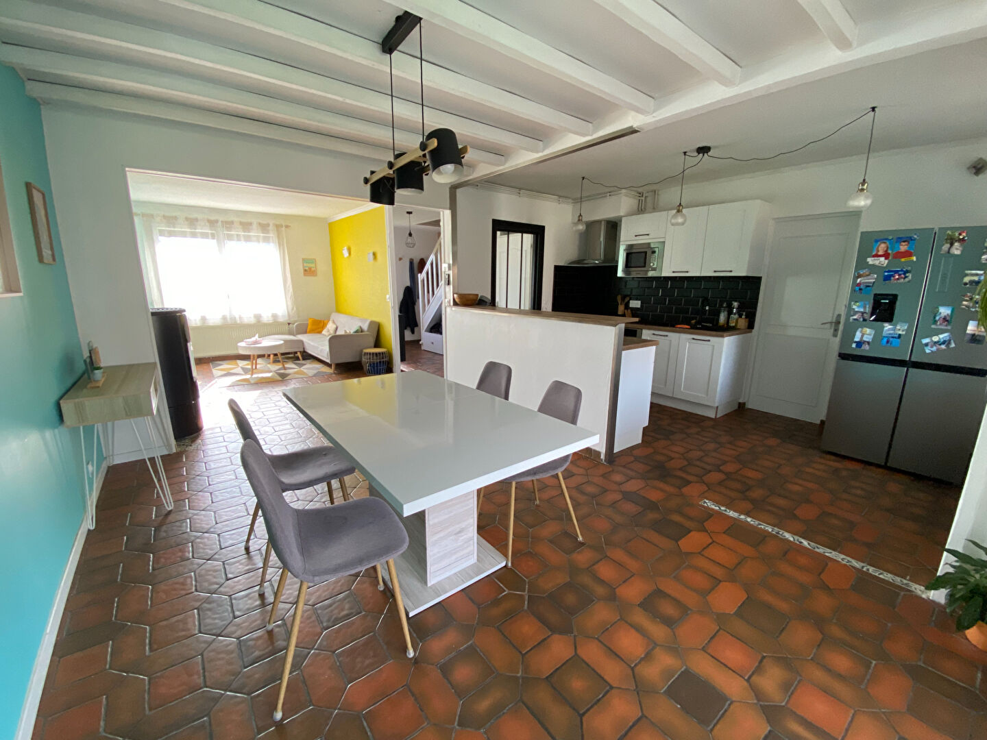 Dès l’entrée vous serez accueilli par un hall d’entrée qui dessert un bel espace de vie lumineux avec son poêle à granulés, d’une cuisine ouverte entièrement équipée. A l’étage, le palier dessert 3 belles chambres et une salle d’eau. La maison dispose également d’un garage, d’un parking privatif. Une maison fonctionnelle, idéalement située, avec un beau potentiel familial au coeur de Provin.