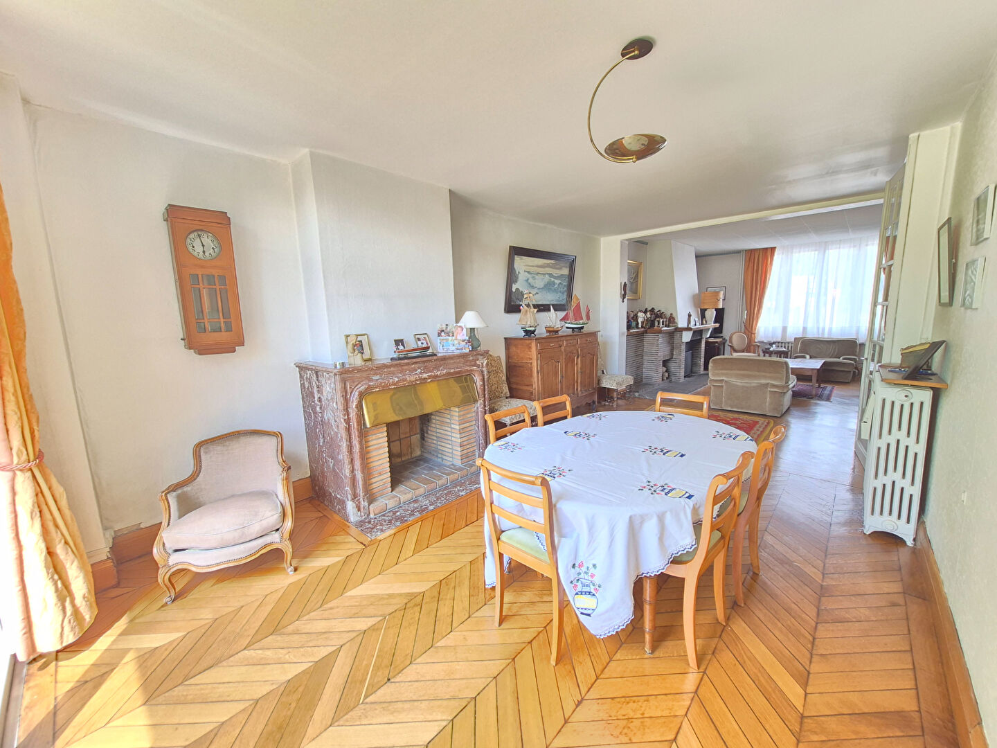 Le hall d’entrée avec vestiaire dessert la pièce de vie de plus de 50m² avec cheminée et parquet ancien, une cuisine séparée de 20 m² avec accès direct à la terrasse et le jardin, une chambre de plus de 18 m² avec salle d’eau.